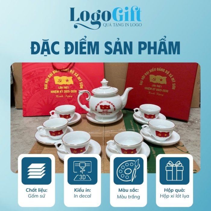 Bộ ấm chén được chế tác từ chất liệu gốm sứ trắng cao cấp, bề mặt phủ men sáng bóng, đảm bảo độ bền và giữ màu sắc tươi mới trong thời gian dài. Ấm có dung tích 500ml, đi kèm bộ chén vừa vặn, tiện lợi trong các buổi tiếp khách, họp hành hay sum họp. Logo được Quà tặng in logo LogoGift in decal rõ nét, sắc sảo, mang ý nghĩa kỷ niệm sâu sắc.