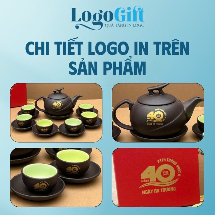 Ngoài ra, lòng chén tráng men xanh tạo điểm nhấn tinh tế, hài hòa kết hợp với màu nâu trầm của chất liệu gốm tử sa, giúp bộ trà quà tặng in logo này trở nên bắt mắt và ấn tượng. LogoGift sử dụng kỹ thuật in decal vàng kim sắc nét giúp logo hiển thị rõ ràng, bền đẹp theo thời gian, nâng cao giá trị thẩm mỹ và hiệu quả quảng bá thương hiệu.