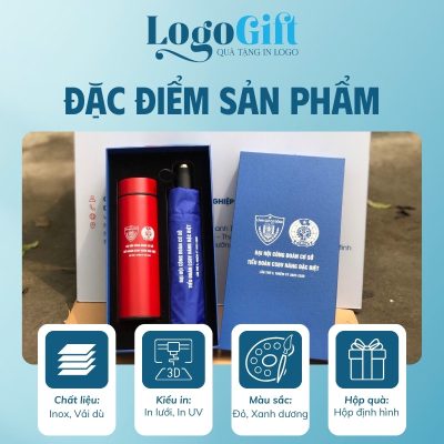Combo quà tặng bao gồm các vật phẩm hữu dụng như: sổ da, bút ký, bình giữ nhiệt, ô dù, cốc sứ,... dễ dàng in logo nổi bật, phù hợp để trao tặng vào các dịp hội nghị, hội thảo, đại hội, kỷ niệm thành lập, tri ân khách hàng thân thiết,...