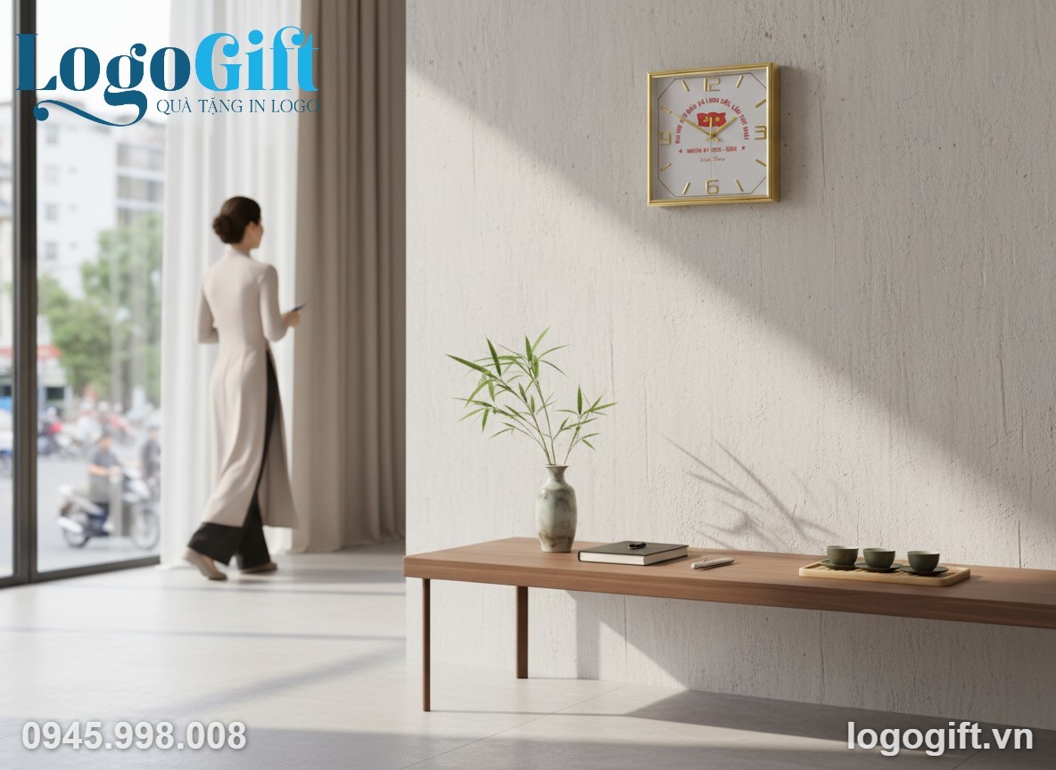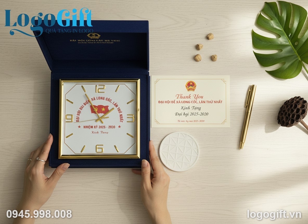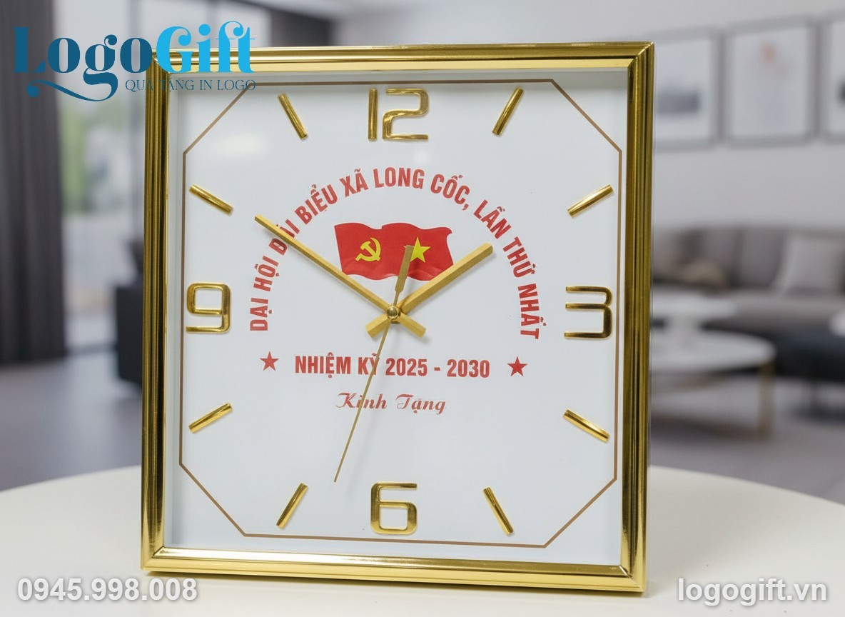 Đồng hồ treo tường quà tặng in logo dáng vuông 35cm xi vàng số cọc LG-DH36 là giải pháp quà tặng trang trọng cho sự kiện Đại hội các cấp. Những chiếc đồng hồ treo tường in logo quà tặng là công cụ theo dõi thời gian chính xác, đồng thời còn mang giá trị biểu trưng sâu sắc, thể hiện sự ghi nhận, tri ân đối với những đóng góp của các đại biểu và thành viên tham dự Đại hội.