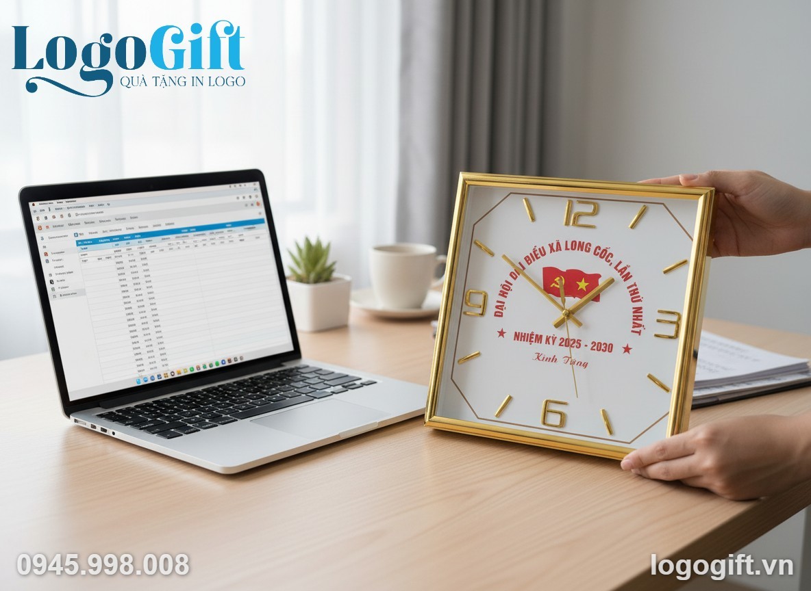 - Logo in offset chuyên nghiệp: Trên bề mặt đồng hồ, logo, tên sự kiện Đại hội và thông điệp được in offset sắc nét, bền màu, thể hiện sự trang trọng và lưu giữ dấu ấn về một nhiệm kỳ đại hội thành công.