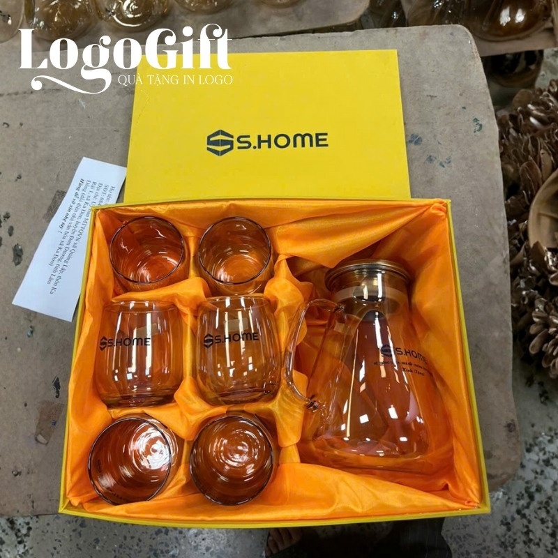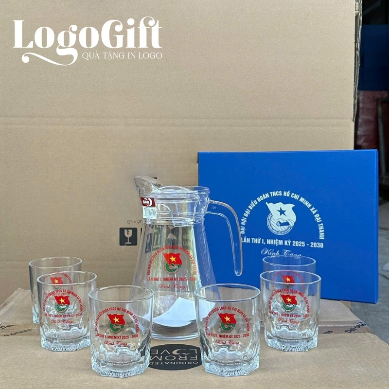 Bộ bình cốc thủy tinh in logo là món quà tặng gia dụng thiết thực, giúp không gian phòng khách của người lao động thêm phần tiện nghi trong dịp Tết 2026. Mỗi bộ sản phẩm thường bao gồm 1 bình chứa nước dung tích lớn và 6 cốc đồng bộ, được tuyển chọn từ những thương hiệu uy tín hàng đầu như Deli, UG, Luminarc hay Ocean.