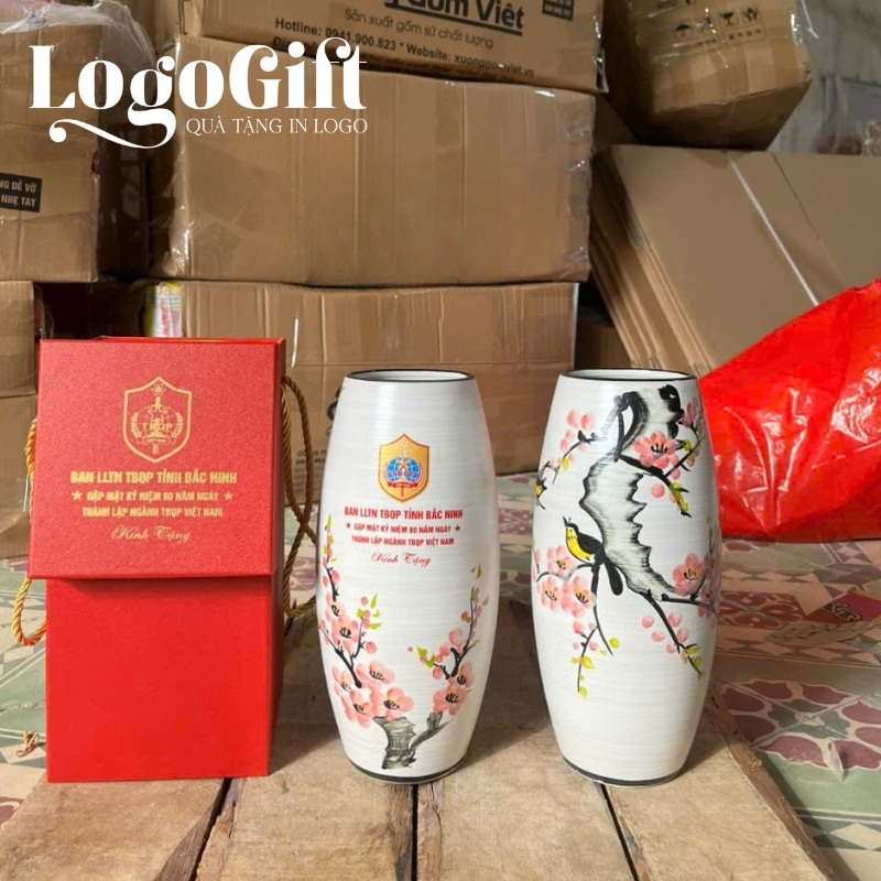 Lọ hoa gốm sứ in logo là món quà trang trí mang ý nghĩa mang lại sức sống và sự tươi mới cho ngôi nhà vào dịp đầu xuân năm mới. Khách hàng tại xưởng LogoGift có thể thoải mái lựa chọn đa dạng các kiểu dáng như dáng bom, đùi dế, cổ rụt hay dáng ống tùy theo sở thích và gu thẩm mỹ.