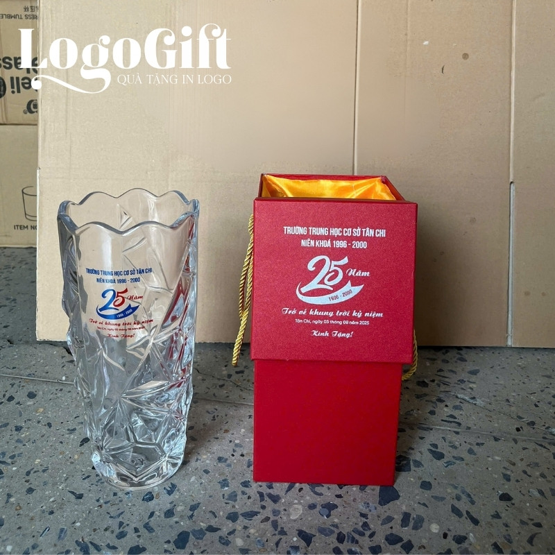 Các mẫu bình hoa thuỷ tinh in logo sắc nét kèm hộp đựng sang trọng, cao cấp